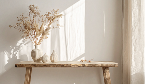 自然素材は光の当たり方によって表情が変わり、空間に豊かさを加えます。色だけでなく質感にも注目することで、より完成度の高いインテリアを実現できます。